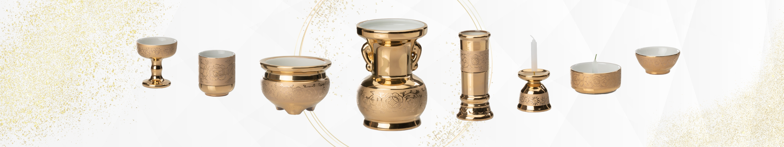 「山源の金唐草仏具」は、美濃焼の技法でオリジナルの唐草模様を装飾した【日本製】の総金仏具です。